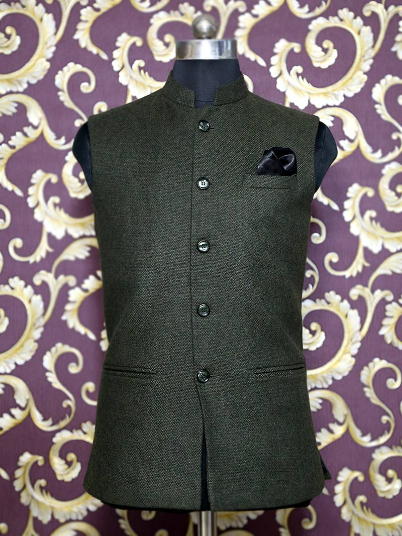 Bottle Green Tweed Men Waistcoat will enchane your personality. The design elements have a mandarin collar with a buttoned front placket and multiple welt pockets.