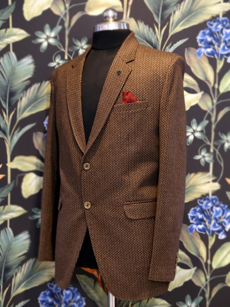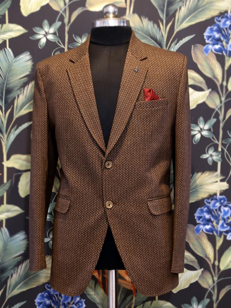 Cinnamon Brown self Design Regular-fit single-breasted blazer, has a notched lapel collar, long sleeves, button closure and a pocket square portray simplicity to your attire.