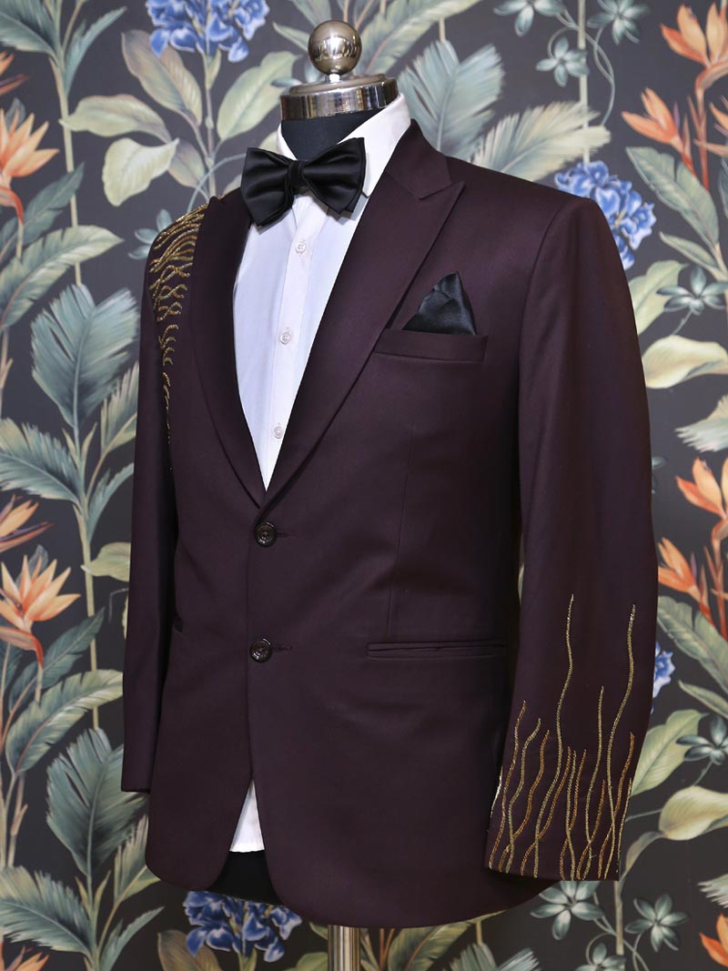 Update your wardrobe with the fashionable Dark Wine Imported Fabric suit with glossy golden cutdana work corals pattern on shoulder and cuff, suitable for a Wedding or Reception. It comes along with White Shirt, Bow, Pant and Satin Pocket Square.