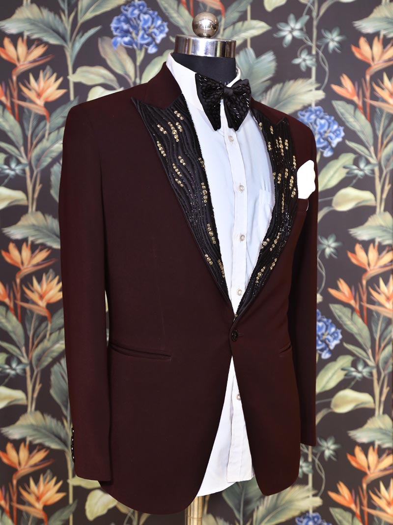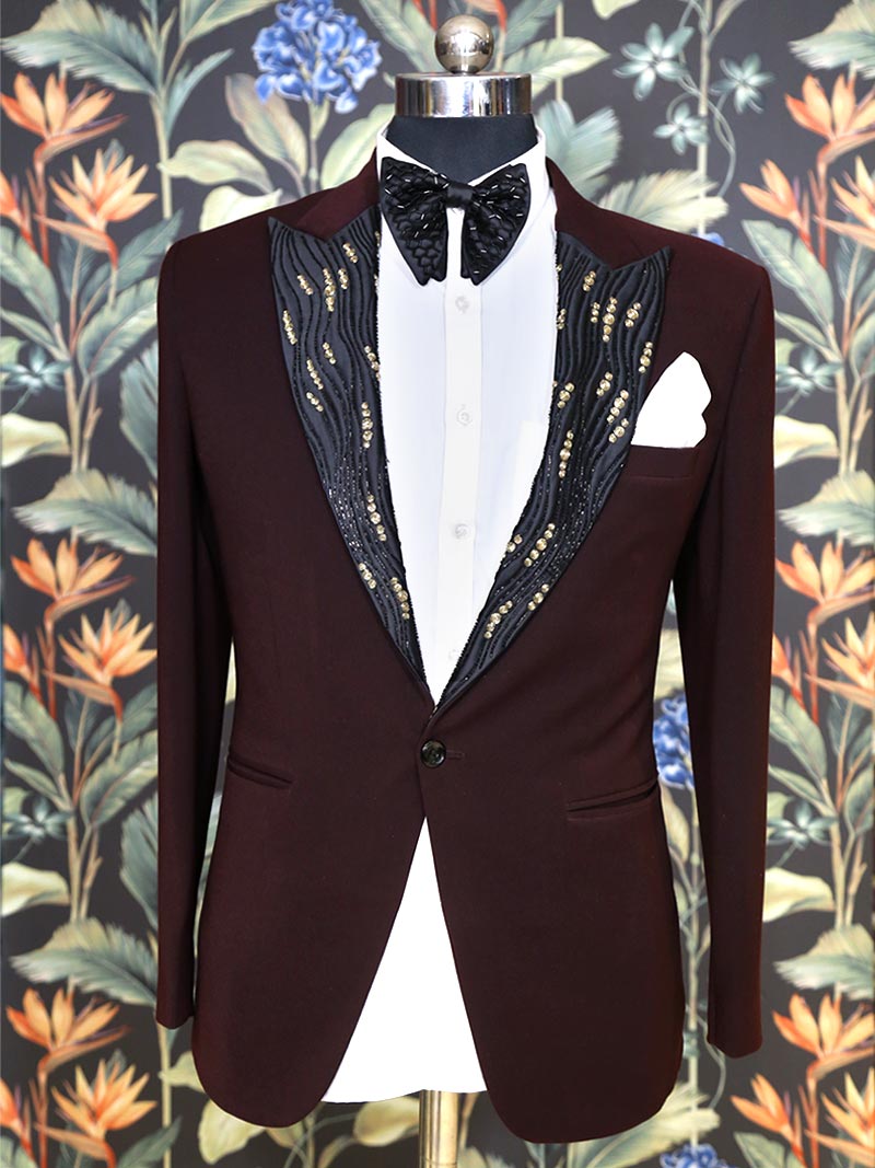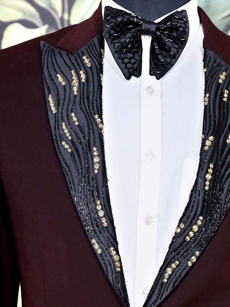 This Imported Fabric Dark Wine Suit with golden beads and Cutdana work on Black Tuxedo is must for any wardrobe collection. Along with Sating Bow, White Cotton Shirt, Pant and Pocket Square.