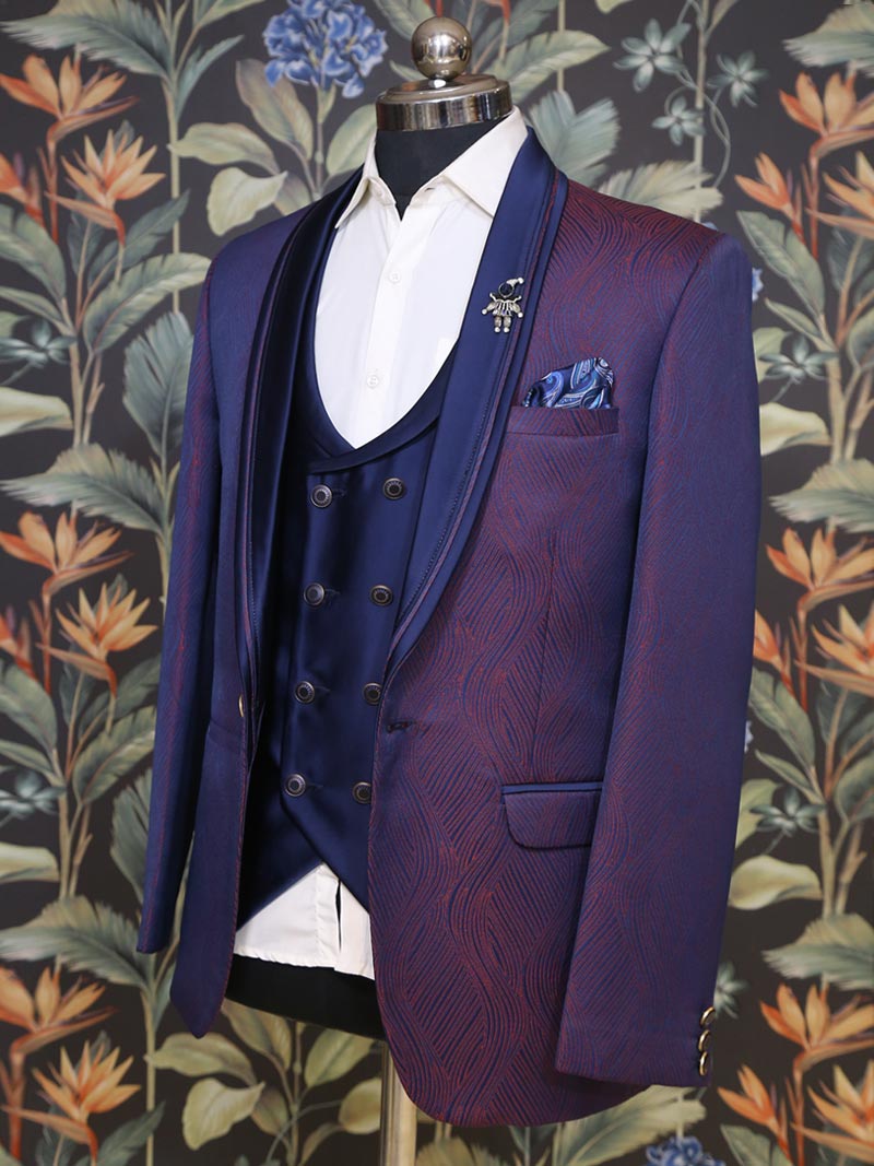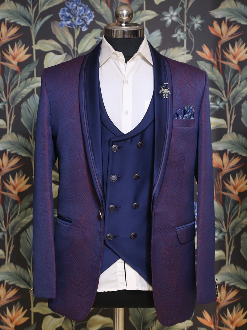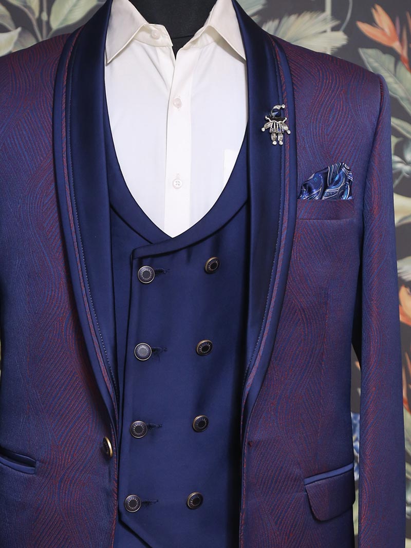 Available at Mubarkaan is Mahogany Suit with glossy Blue collar lapels and blue double-breasted Waistcoat is a perfect blend of style and comfort. It comes with a White Cotton Shirt, Pocket Square and Pant for any occasion.
