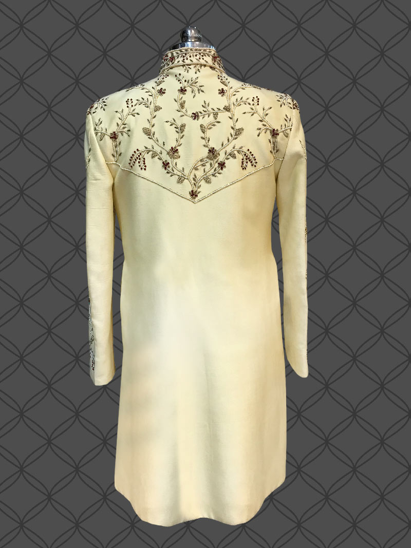 This handwoven Pista Green Sherwani is designed to create the illusion of a lengthy figure. It is made with silk material, the traditional Turkish art inspires the motifs on it.