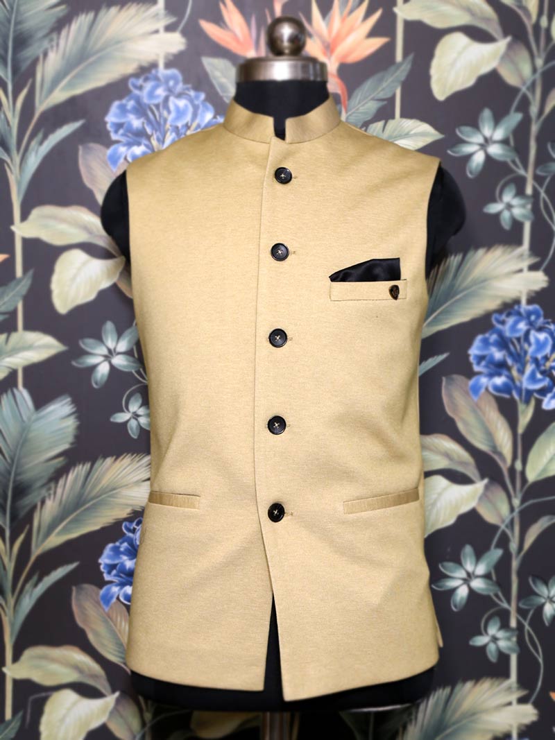 Own this classic Fawn Waistcoat that can turn any outfit into a formal one without being troubled by the summer heat. The design elements have a mandarin collar with a buttoned front placket and multiple welt pockets.