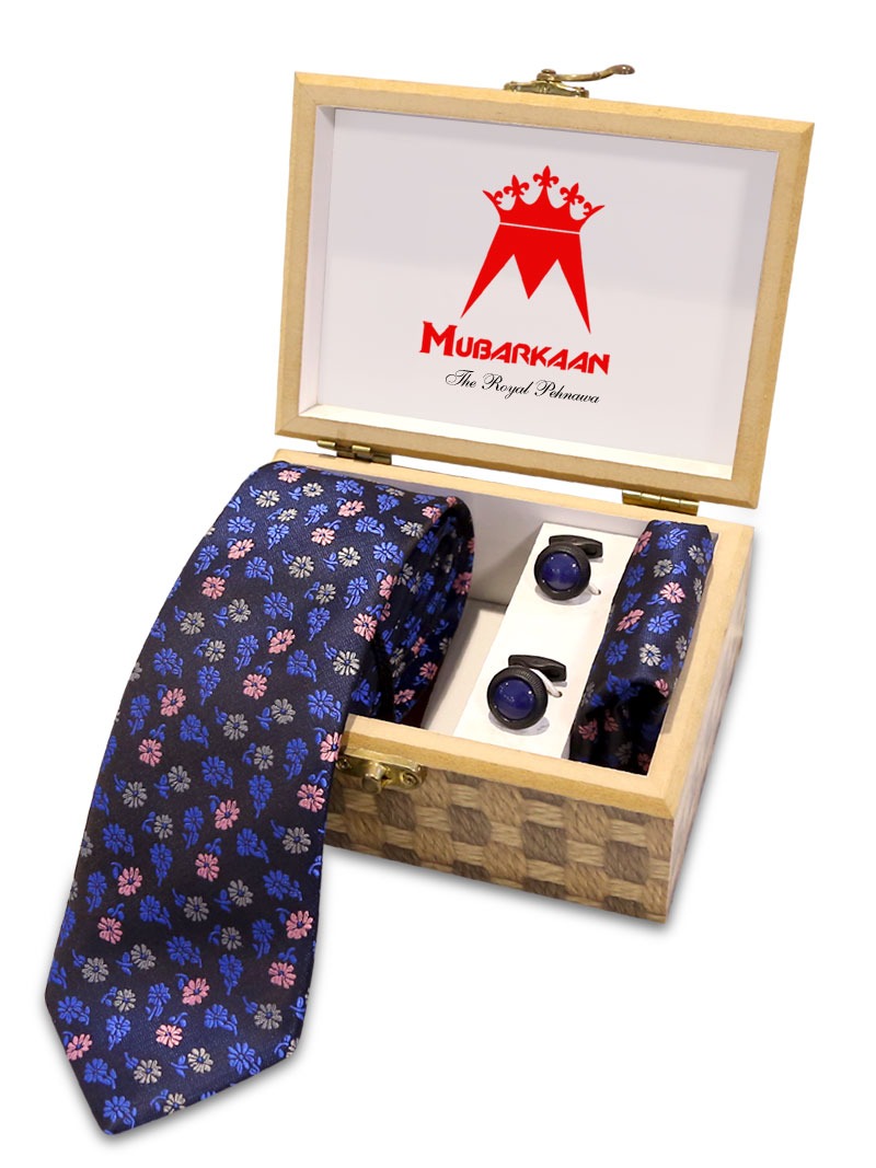 These stylish printed tie along with matching pocket square can be worn of wedding anniversary or can be given as gift to most loved one. It has a pair of solid round cufflinks. Comes in an attractive Wooden Box.