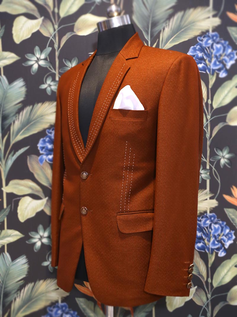 Rust Solid single-breasted blazer, has a notched lapel collar having white thread design with button closures, long sleeves and pocket square.
