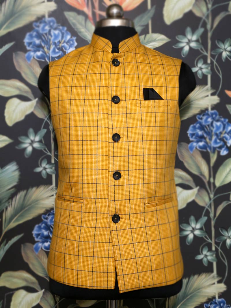 The perfect companion for your ethnic look, this Orange Check waistcoat will be a solid choice. This sleeveless coat features a mandarin collared neckline with a buttoned front placket and multiple welt pockets.