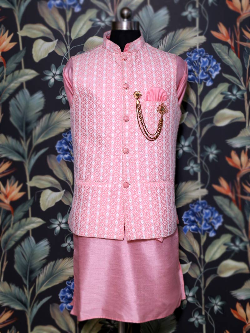 Flaunt your traditional look in this elegant Pink kurta pajama with waistcoat set features a unique combination of design and handwork, which makes you look your ethnic best.