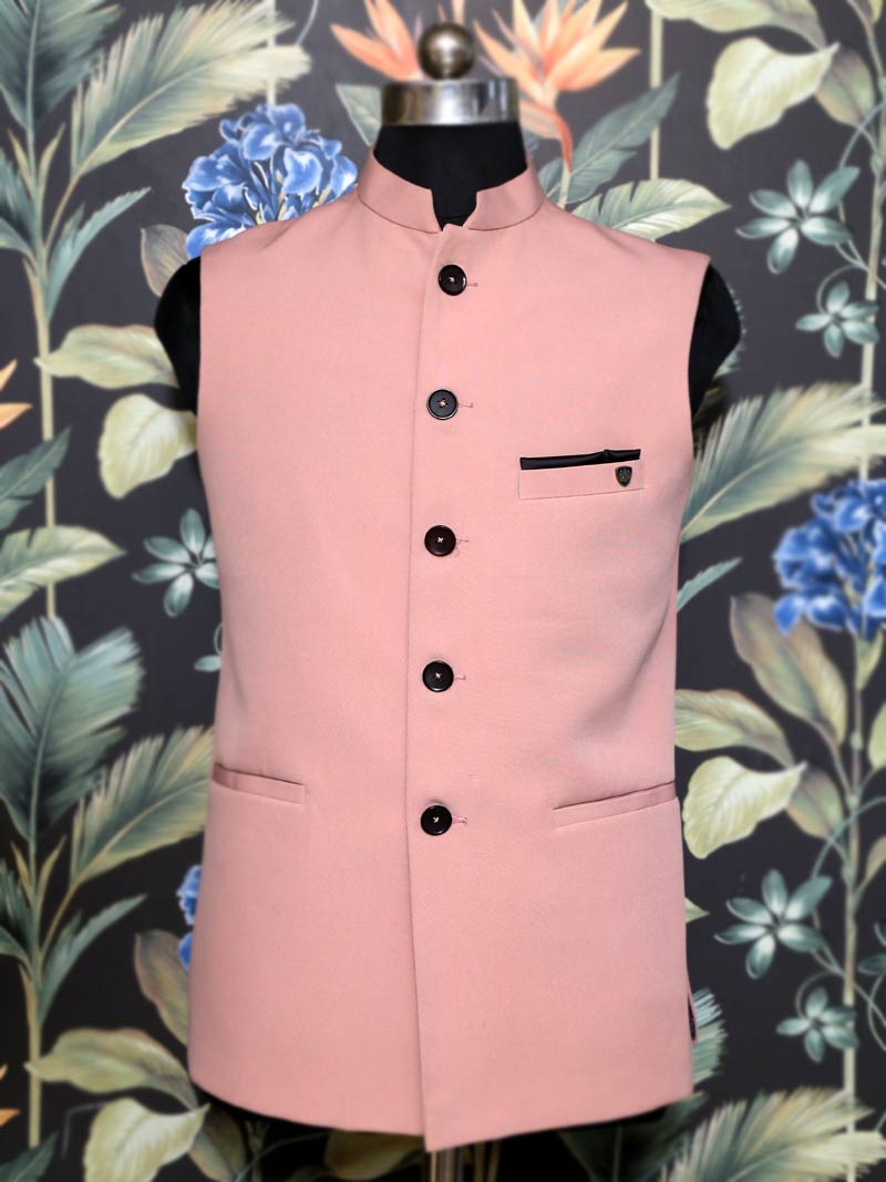 The perfect companion for your ethnic look, this Pink Plain waistcoat will be a solid choice. This sleeveless coat features a mandarin collared neckline with a buttoned front placket and multiple welt pockets.