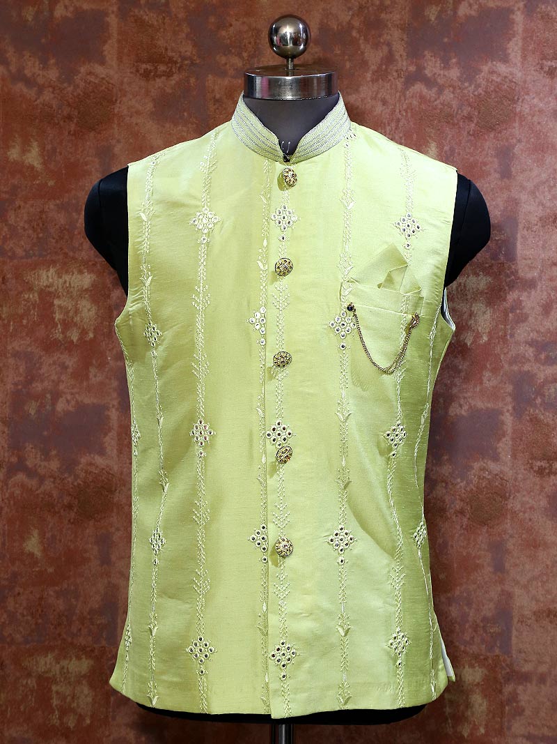 Get this Pista Green Embroidered Waistcoat with mandarin handwork collar, Stylish Buttons and a matching Pocket Square to enhance your personality.