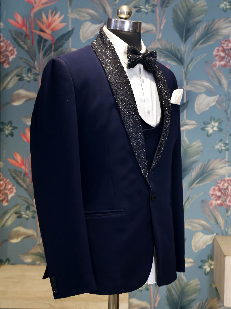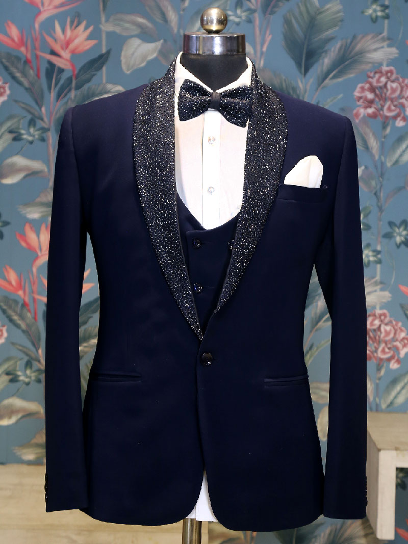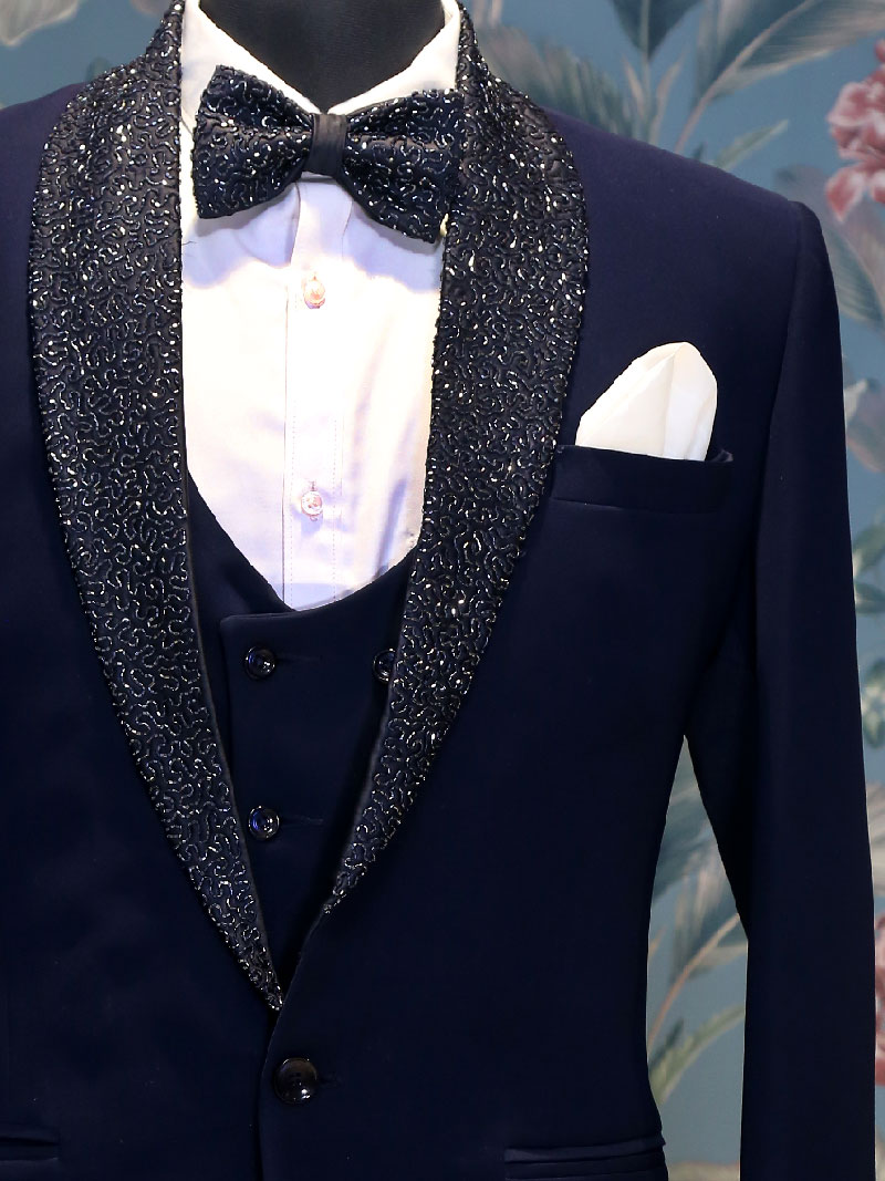 Get this unique Blue Suit with beautifully hand work crafted Collar, adorned with matching Bow. This suit comes with matching color Waist Coat, White Shirt, Pant and Satin Pocket Square.